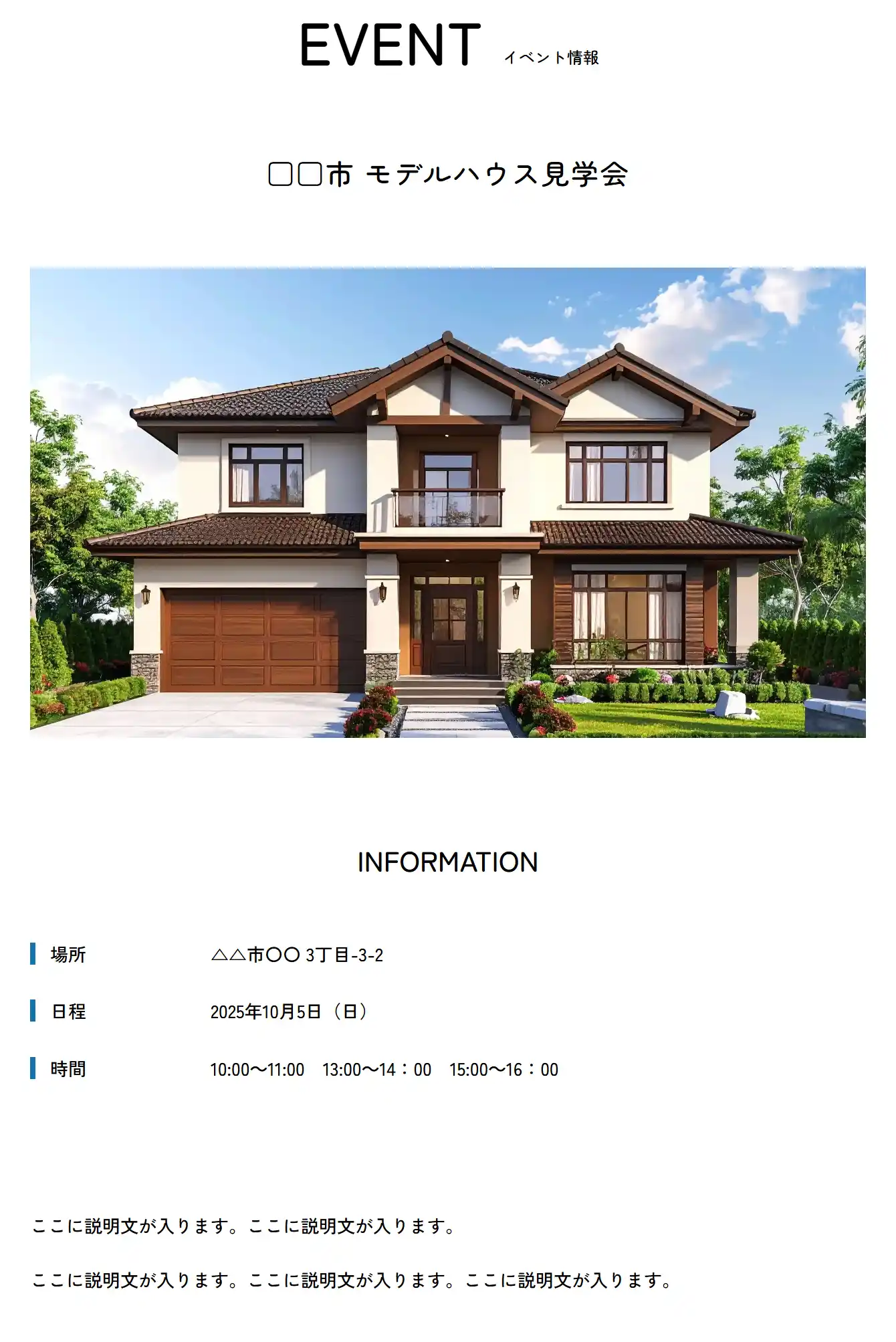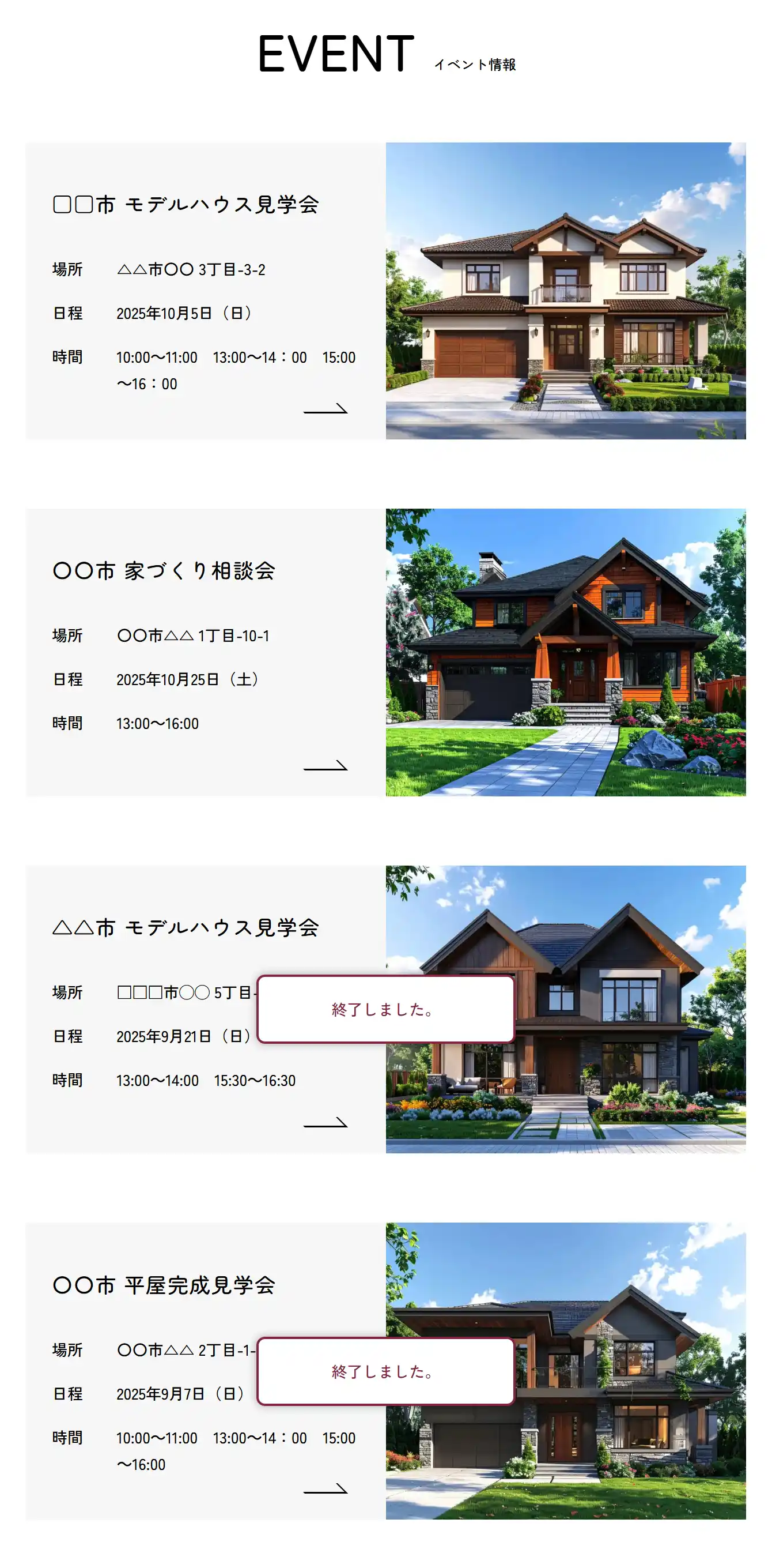 こちらのページ(用意されたひな形に入力するだけで、デザインされたページが完成)の「イベント情報ページ」版です。