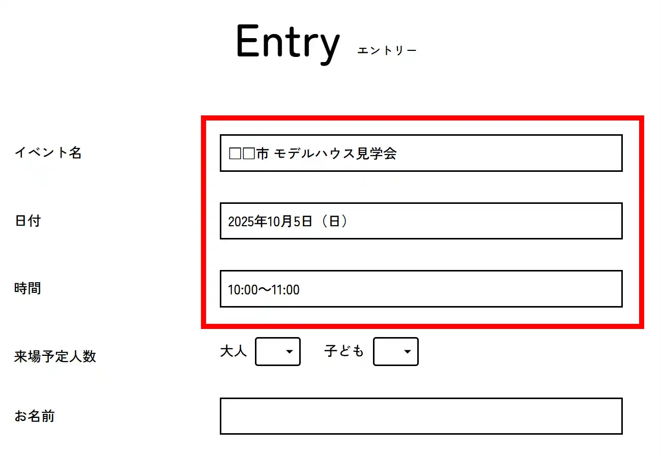 こちらがエントリーページです。イベントのタイトル・日程・時間といった情報が自動的に引き継がれます。